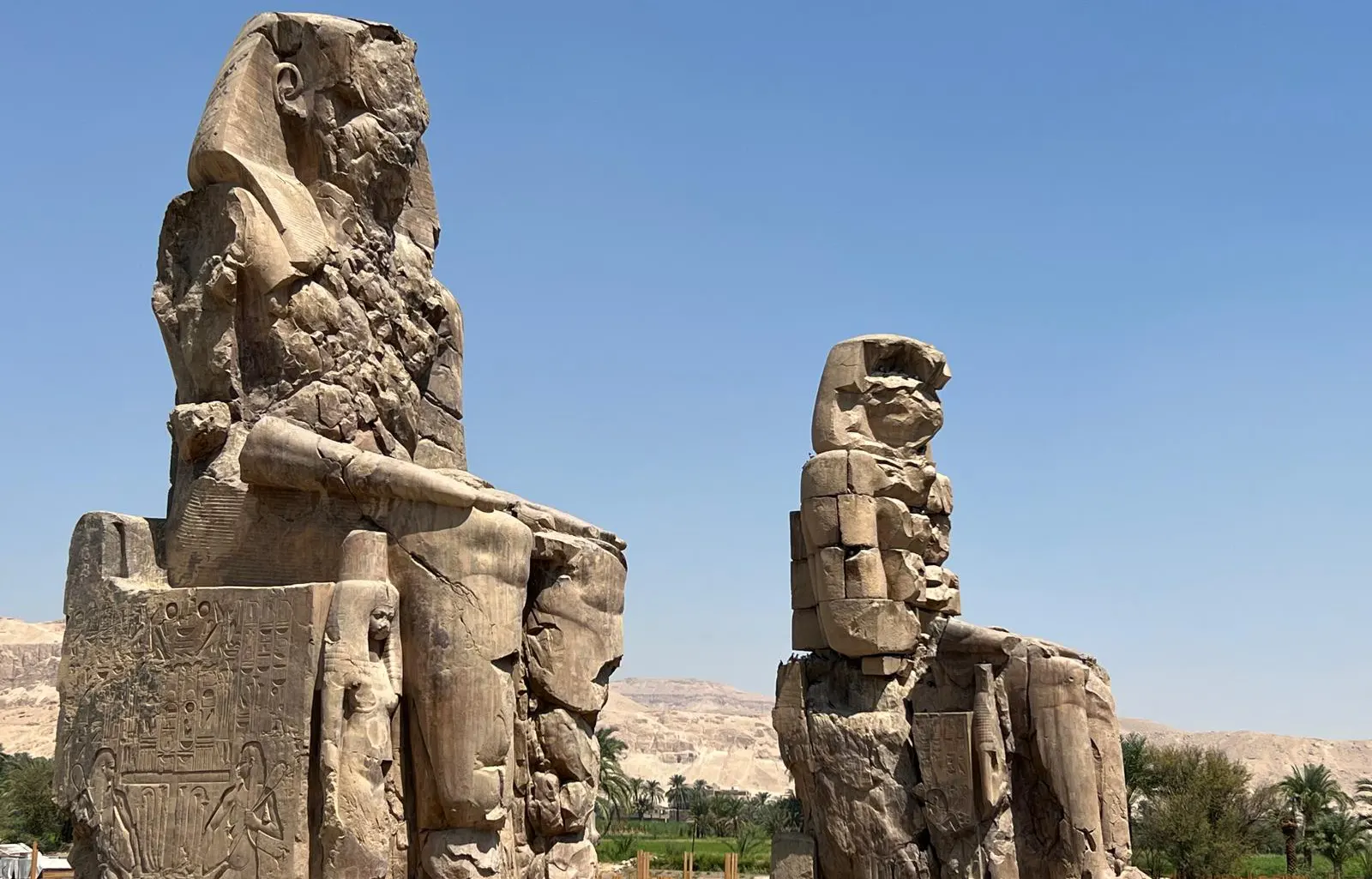 besichtigen Sie die Memnon-Kolosse, zwei über 18 Meter hohe Sitzfiguren, die einst den